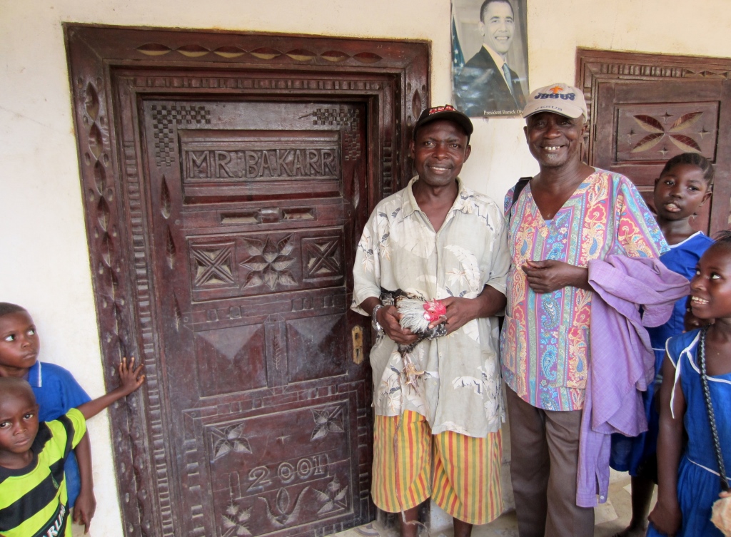 Mr. Bendu Obama fan Published June 28, 2013 at 1024 × 753 in Obama’s Bumpeh Chiefdom fans ← Previous Next → Mr. Bendu, left, of Moyeamoh village, proudly wears his Obama hat in front the Obama picture on his front porch. (He’s holding the chicken I’ve been presented with.)