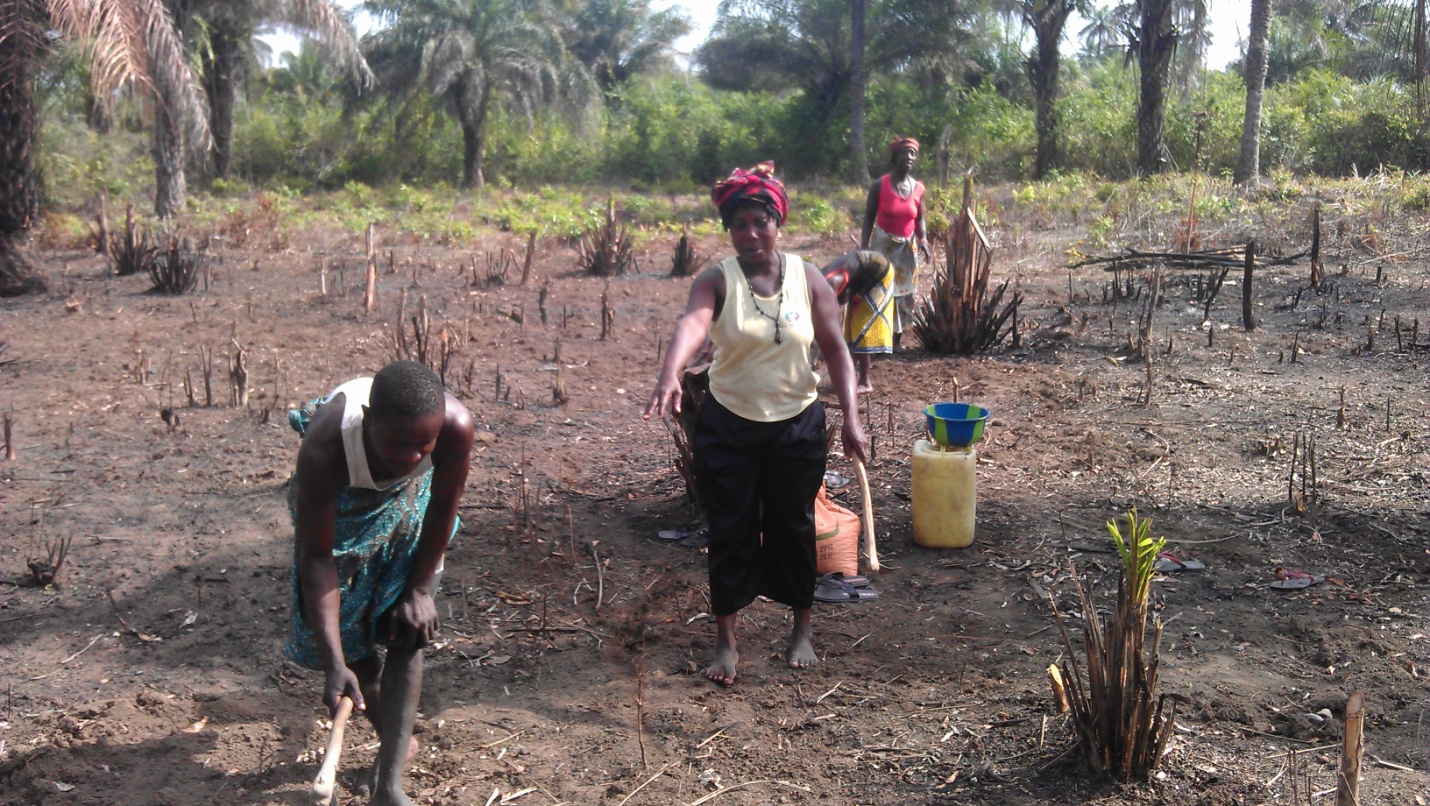 Veg project women breaking ground 5-15Clearing a field manually is really hard work. It’s typical in slash-and-burn agriculture to fell the biggest trees, and burn the rest of a field for planting. I’ve watched women farming  in Sierra Leone before. But sitting in the comfort my home looking at these pictures of bare foot women breaking ground in a hard, burned-out field with little hand-made hoes pulls at my heart strings. They’re determined to provide for their children and get on with their lives. And they somehow do, by sheer will – and hard labor.