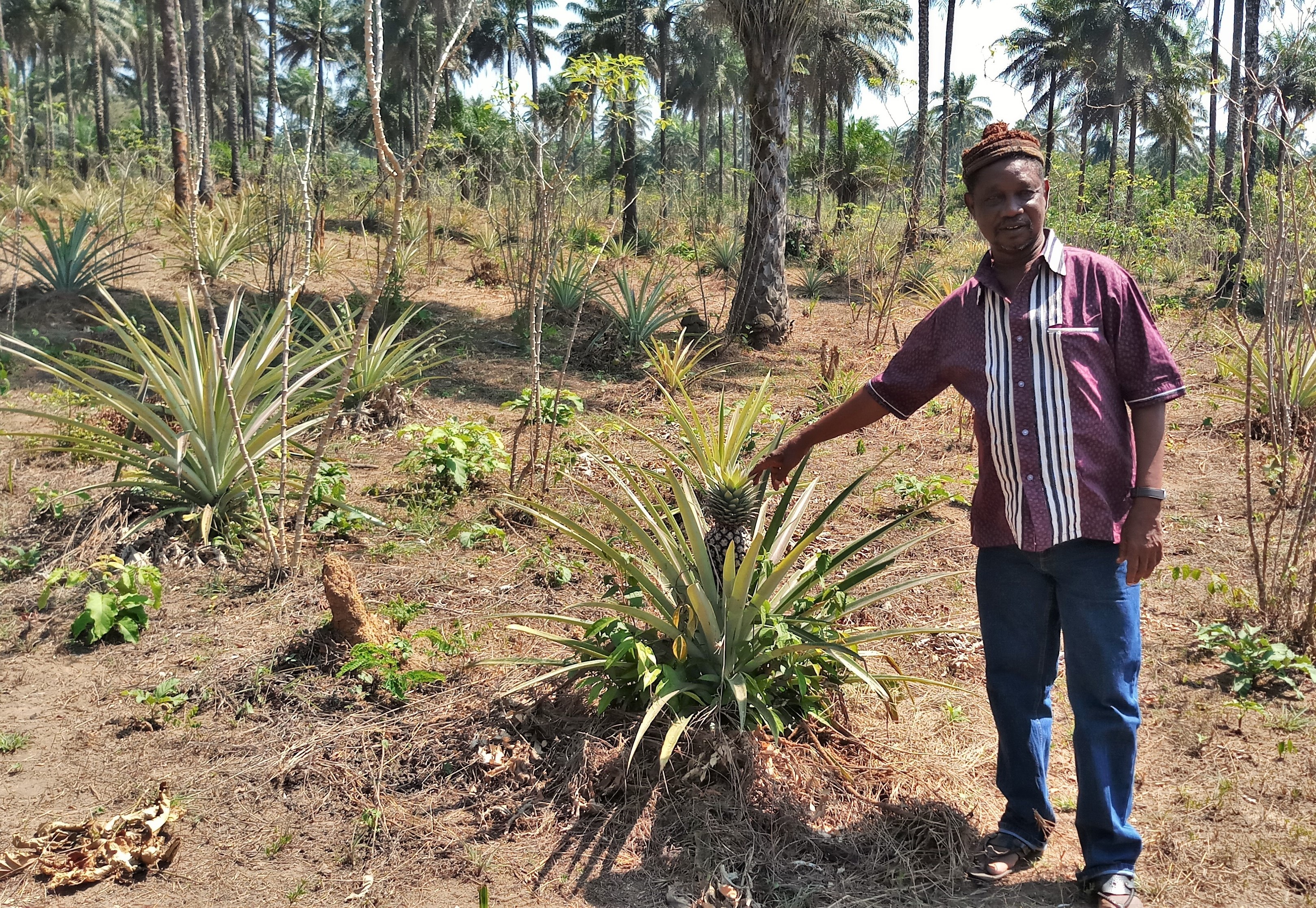 Bumpeh Chiefdom Paramount Chief Caulker, above, shows one of over 1000 pineapples planted in the rains of July 2016 that are doing well and starting to sporadically fruit.